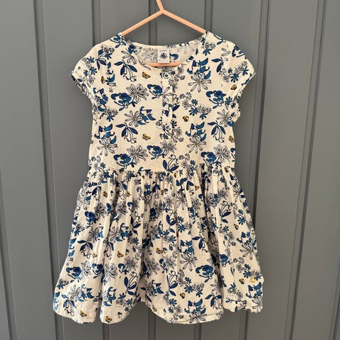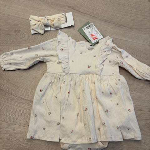 Lindex kjole for baby i størrelse 68. Kjolen er laget i bomull og har et flerfarget blomstermønster på lys bunn. Kortermet modell med rynket skjørtedel.