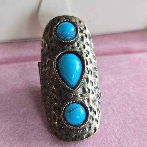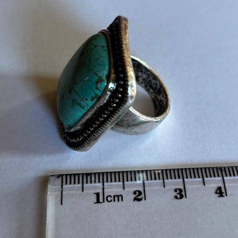 Flott, kraftig ring med stor turkis stein (sannsynligvis kunstig). En solid "statement"-ring. Fingeråpningen er 2,2cm i diam. Ringen kan sendes. Kr. 250