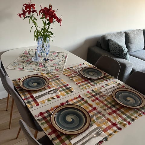 2 pene, beige bordløpere kjøpt på Europris. Løperne har et klassisk ton-i-ton diamantmønster og dekorative frynser på kortsidene. De er laget i 100% bomull og gir en lun og naturlig følelse til bordet.