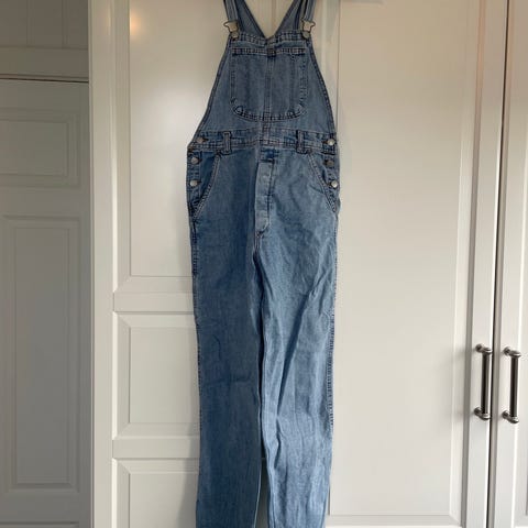 American Eagle snekkerbukse / selebukse for dame i størrelse XL. Buksen er laget i blå denim. Den har justerbare seler, stor brystlomme foran og flere lommer i sidene. Det er en tydelig rift/hull ved det ene kneet og slitasje nederst på beina, som gir et brukt og slitt uttrykk, dette er slik busken var da den ble kjøpt!