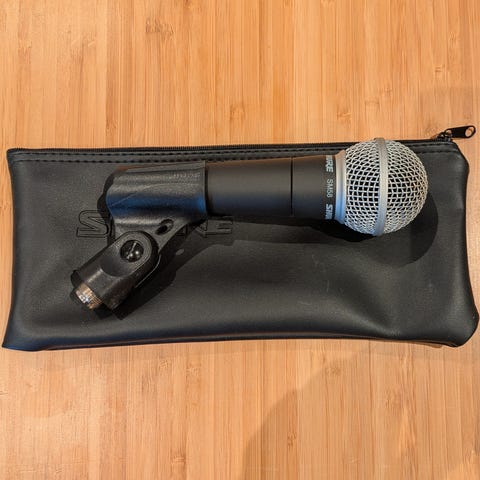 Shure SM58 dynamisk vokalmikrofon i svart utførelse. Mikrofonen har metallgrill og er egnet for vokalbruk på scene, øving eller enkel tale/PA. Settet på bildene inkluderer mikrofon, mikrofonholder, oppbevaringsetui og en liten reservedel. Passer til standard mikrofonstativ med medfølgende holder.