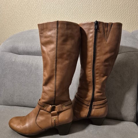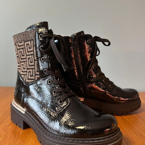 Hoye stovletter fra Rieker i skinn med strukturmenstrede strikkpaneler pa sidene og glidelas pa innsiden. Brukt en gang, som ny. Komfortabel antistress-innersale som former seg etter foten og reduserer tretthetsfolelsen. Mykt fôr. Skaftheyde ca. 40cm
