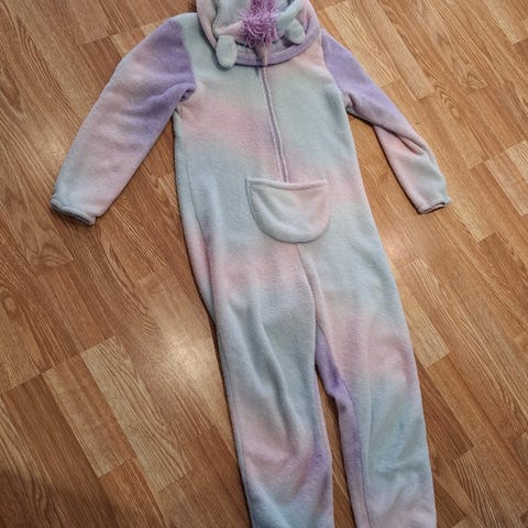 Onepiece fra Lindex i str 134/140, 8 - 10 år. Heldress med glidelås foran med hette med ører og katteansikt, hale bak.
