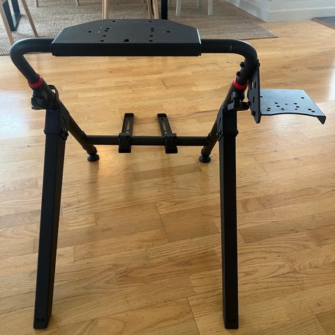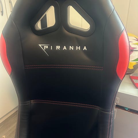 Piranha racingsete med stativ for ratt og pedaler i svart med røde detaljer. Setet har bøtteformet utforming med gjennomgående åpninger i ryggstøtten. Stativet har egen plate for pedaler foran og sideplate egnet for girspak eller annet tilbehør. Justerbare fester og skruer gjør det mulig å tilpasse avstand og plassering av ratt, pedaler og tilbehør. Egnet som kjøresete til racingspill og kjøresimulatorer i kombinasjon med kompatibelt ratt- og pedalsystem.