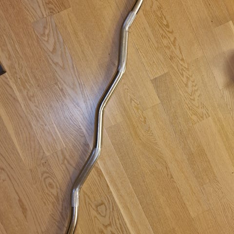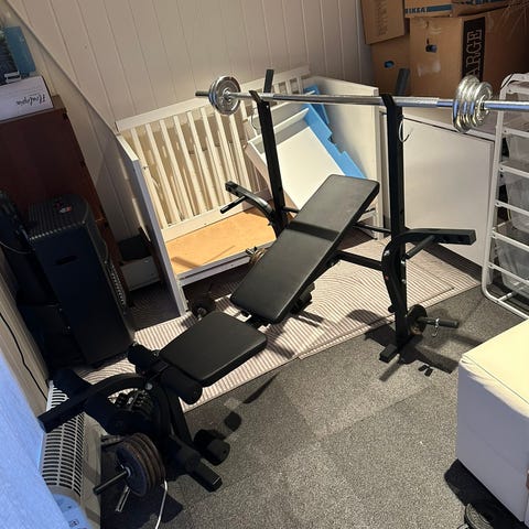 Benk med vektstang med tilhørende vektskiver for styrketrening hjemme. Settet inkluderer en lang stang og flere fargede vektskiver i ulike vekter.