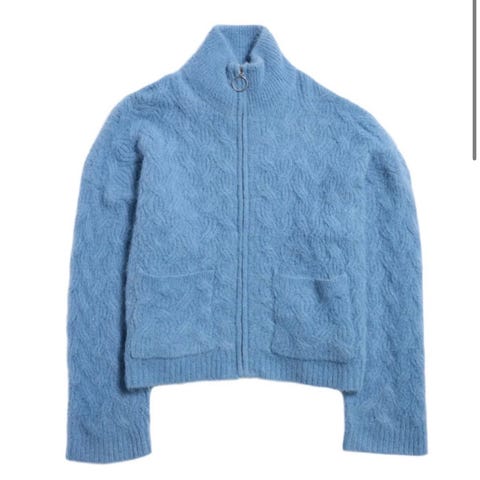 Holzweiler cardigan for dame i størrelse XS. Cardiganen er i blåtoner og strikket i alpakkaull. Modellen har høy hals, glidelås i front og to påsydde lommer foran. Strukturen i strikken gir et mønstret uttrykk med felt i ulike nyanser av blå.