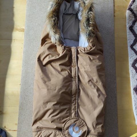 Vognposen er med dunfyll og ytterstoff i økologisk bomull. Den har åpninger for seler, hette med pelskant, samt glidelåsåpning for enkel tilgang. Forlengerdel medfølger.
