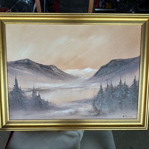 Vintage håndmalt oljemaleri på lerret med dekorativ gullramme. Vakkert landskapsmotiv. Slike malerier ble ofte laget 1950-1980 tallet for dekorasjon i hjem, hoteller og hytter.