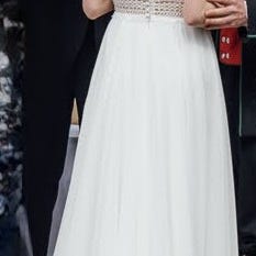 Kan tilpasses i rygg. Kjolen har fine detaljer, perler foran og i ryggen.