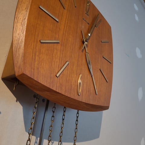 Retro vegg klokke fra Ams i Teak med lodd, noe bruksmerker er satt etter tidens tann.