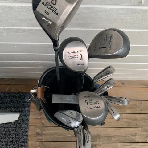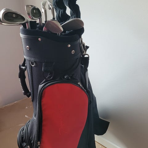 Black Owl Golf bag i svart og grå. Sett med jernkøller med grafitt- eller stålskaft (se bilder for detaljer). Golfbagen har flere lommer for oppbevaring av utstyr og 14-delt topp for organisering av køllene. Det følger med to rør med Titleist NXT Tour golfballer. Egnet for bruk på golfbane og trening på driving range og nærspillsområder.
