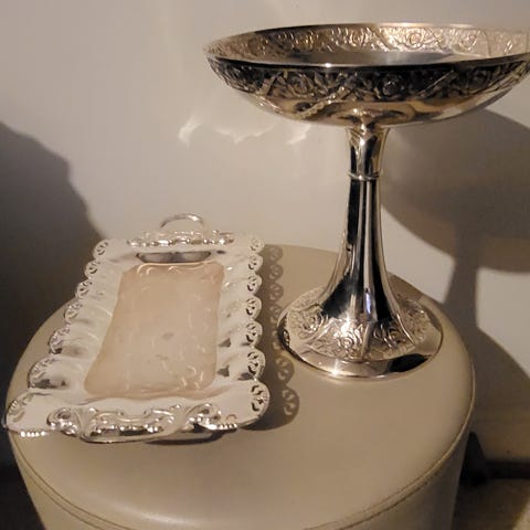 Fint, eldre, rundt skrin/smykker/servering med innv. glass skål.