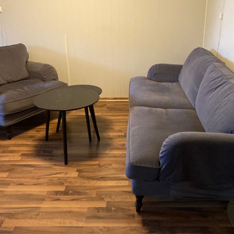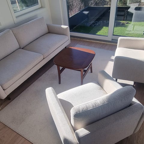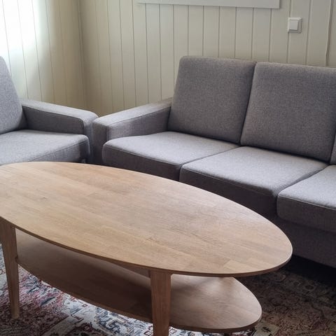 1 Grip sofa og 2 Bliss stoler med Axel Dark blue stoff med sorte stålben. Sofa/stoler har fast sete og har en fantastisk sittekomfort. Norsk design og kvalitet.