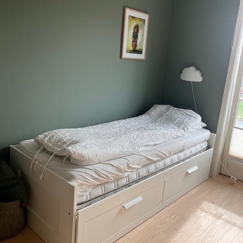 Sengen er i god stand og ser nyere ut enn den er. Passer godt i rom med skråtak eller der det er behov for ekstra lagringsplass under sengen.