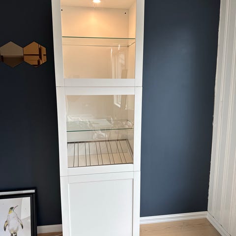 Vi selger et vitrineskap fra IKEA av merket Bestå i fargen hvitbeiset eikemønster. Skapet har glassdører og to glasshyller som følger med, samt integrert dørlukker. Pent brukt uten nevneverdige merker.