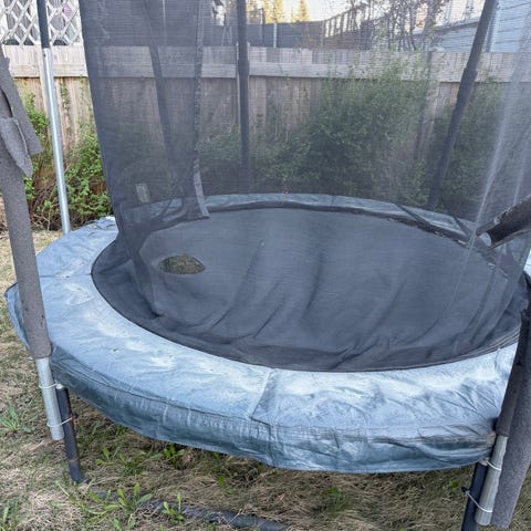 Følger med sikkerhetsnett og stige. Trampolinen er hel og fungerer som den skal. Monteringsanvisning følger også med.