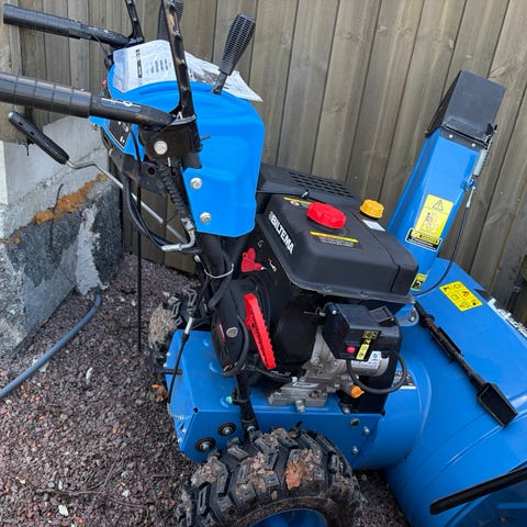 Meget lite brukt. Snøfreseren har en stor motor på 11 hk og hiver snøen veldig langt. Jeg har ikke brukt opp første tanken med bensin, har heller ikke tatt første olje skift.Snøfresen har stått ute under tak med Biltema trekk til snøfreser. Selges fordi den er for stor for meg.