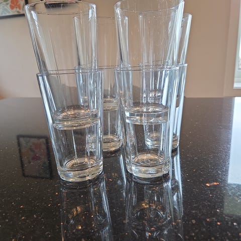 8 stk Rosendahl glass i klart glass. Høyt drikkeglass som passer til vann, juice og andre kalde drikker. Enkel, rett fasong med solid bunn. Egnet til daglig bruk på kjøkken eller spisebord. 37cl