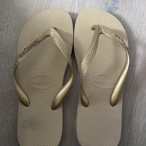 Havaianas flip-flops sandaler i størrelse 38. Sandalene har beige såle og stropper i metallisk farge. Sålen er lett forhøyet med strukturert undersåle for bedre grep. Egnet som sommersko eller innesko.