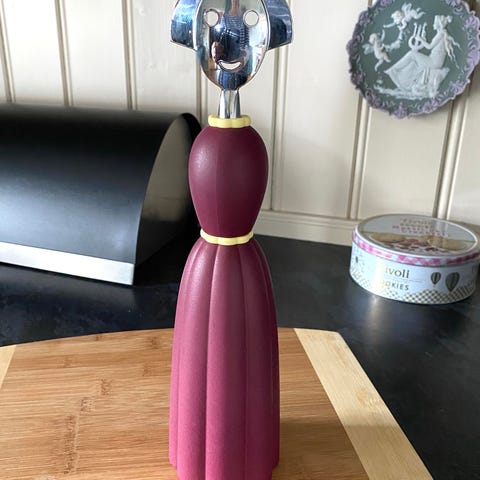 Alessi vinåpner korketrekker i figurform. Korketrekkeren har kropp i mørk rød plast og metall, med armer som fungerer som løftehendler. Toppen er i metall med spiral og figurhode. Egnet til åpning av vinflasker med natur- eller plastkork i kjøkken og serveringssammenheng.
