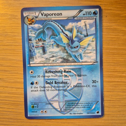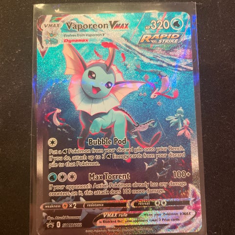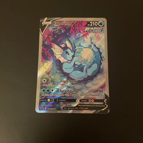 Pokémon Vaporeon V samlekort fra Rapid Strike-serien. Kortet viser Vaporeon V med 210 HP og angrepene Triple Draw og Splash Jump. Standard Pokémon-bakside med blå ramme og Pokéball-motiv. Egnet som samlekort eller til bruk i Pokémon Trading Card Game.