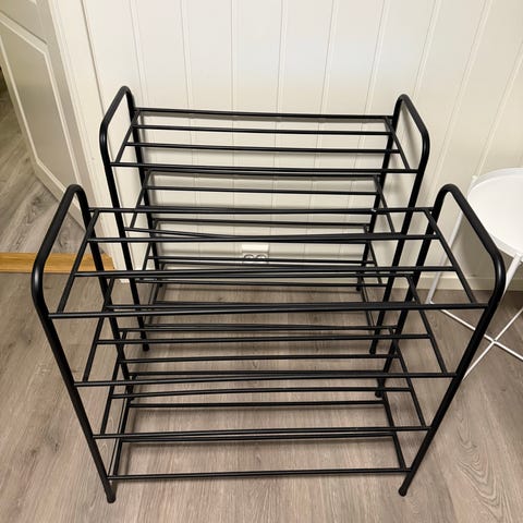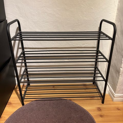Skohylle med sittebenk svart metall og stoff