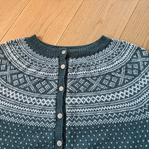 Nystrikket jakke i 100% ull (Kauni) i blågrønn hovedfarge.