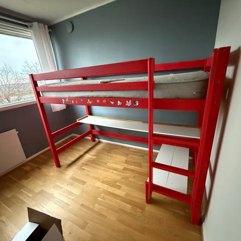 IKEA SMÅSTAD loftseng med skrivebord og oppbevaring. Sengen har liggemål 90x200 cm og er utført i hvit overflate. Under sengen er det integrert skrivebord med skuffeseksjon og åpne hyller på siden. Løsningen gir kombinert soveplass, arbeidsplass og oppbevaringsmuligheter i ett møbel.