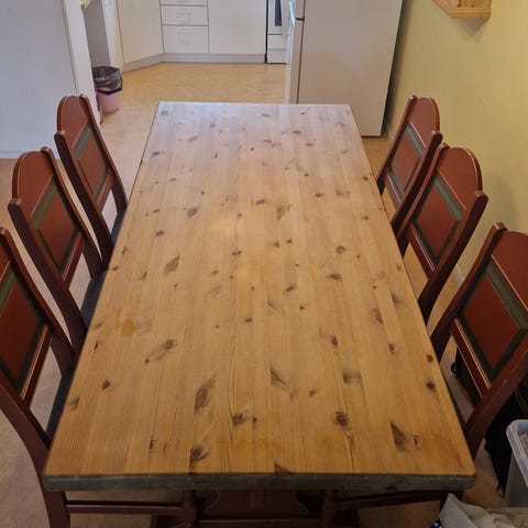 Kan selges samlet som spisestue eller bord og stoler hver for seg.