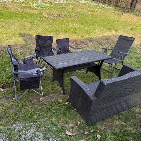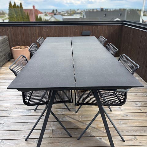 Solid og brukt piknikbord i tre med integrerte benker på begge langsider. Bordet er laget i kraftige treplanker og er egnet for utendørs bruk, for eksempel i hage, på terrasse eller hytte. Klassisk utforming med A-formede ben og sitteplasser på hver side av bordplaten. Overflaten fremstår ubehandlet eller værslitt, noe som gir et rustikt preg og kan etterbehandles etter behov.