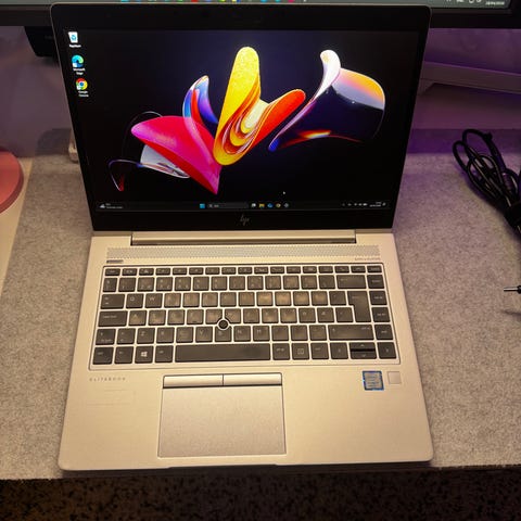 HP EliteBook bærbar PC i sølvfarge. Modellen har norsk tastaturoppsett og pekeplate under tastaturet. Skjermen er hengslet slik at lokket kan brettes langt bakover. Kabinettet er i metallutførelse, og maskinen har HP-logo på lokket. Egnet til generell kontorbruk og hverdagsoppgaver, avhengig av den konkrete maskinvaren i denne enheten.T