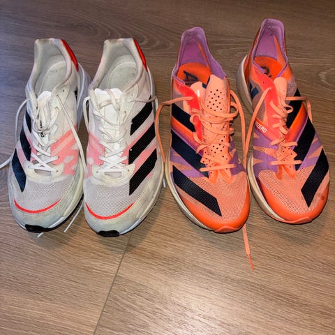 Adidas Adizero løpesko i størrelse 44 2/3. Brukt utendørs en gang, og derav noe flekker, ellers fremstår de som nye. Selges fordi størrelsen var feil. Tar imot bud