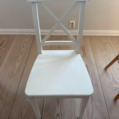 Veldig pen hvitmalt trestol. Den har synlige bruksmerker og noe av malingen er borte, men dette gir også sjarm.
