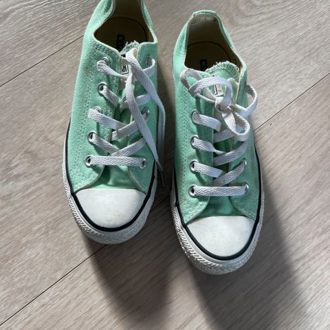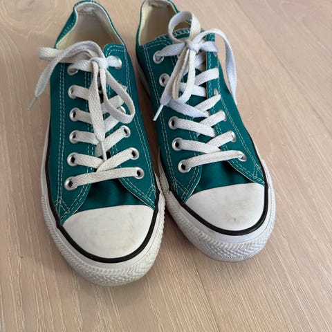 Converse All Star sneakers i størrelse 42. Lave joggesko i grønn tekstil med hvit gummisåle og lisser. Klassisk modell med gummitå og Converse-logo på hæl og pløs. Passer til hverdagsbruk og fritid.