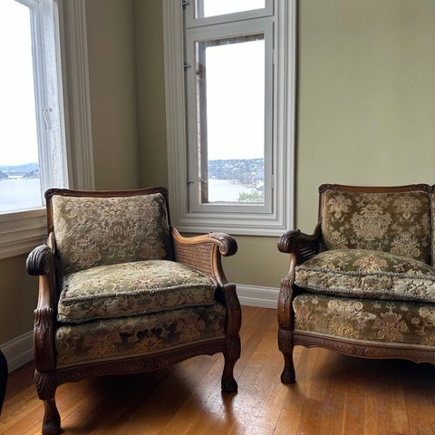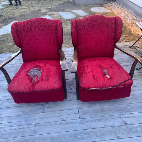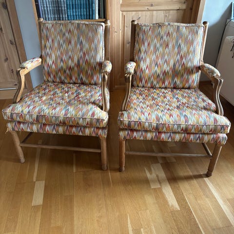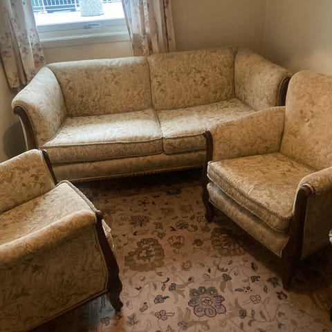 “Klassisk sofagruppe i tre – sofa + 2 lenestoler”. Myk sittekomfort, solide og tunge møbler.