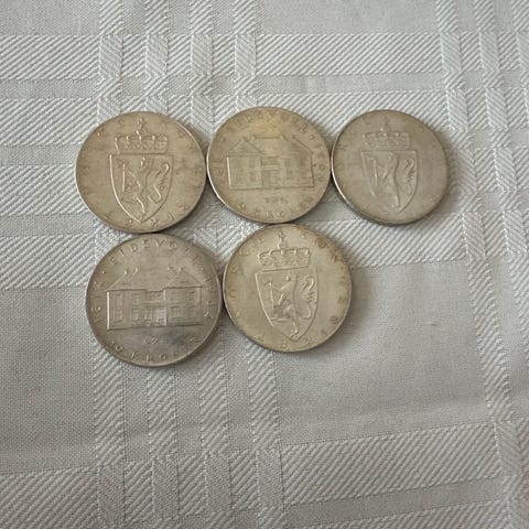 1 øre - 2 øre - 5 øre - 10 øre - 25 øre - 50 øre - 1kr for 1875-1970 og et for 1kr etter - 2 og 5 kr og Norske minnemynter / -Alle som er utgit