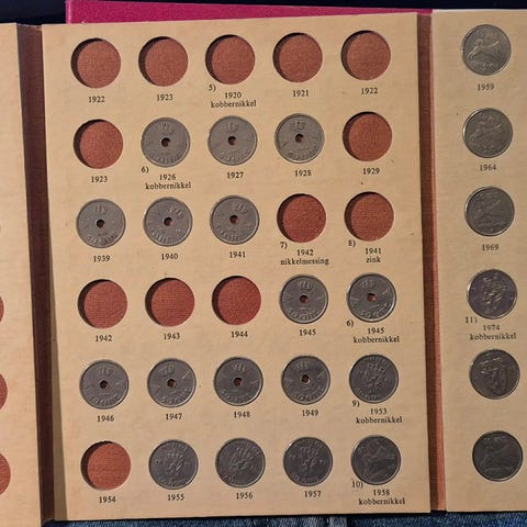 Myntalbum for norske mynter med forhåndsmerkede årstall. Albumet har sider med utsparinger til enkeltmynter, der hvert hull er merket med årstall for enkel sortering og oversikt. Flere av hullene er fylt med mynter, mens andre er tomme. Egnet til oppbevaring og systematisering av en samling norske mynter etter årstall.