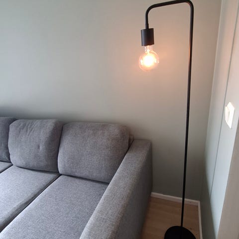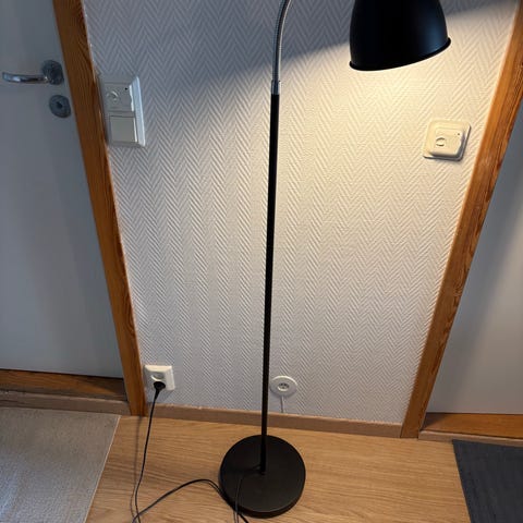 Selger en stilren gulvlampe i matt svart metall. Lampen har et moderne, buet design som passer perfekt ved siden av sofaen eller i en lesekrok. Lyspære følger med. Noen bruksmerker se bilde. 150cm høy.