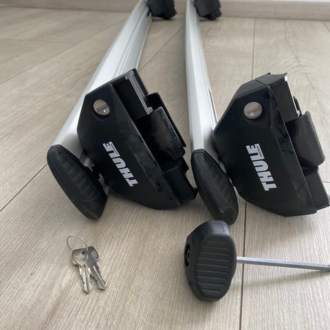 Stenger: Thule WingBar (aerodynamisk profil, aluminium), lengde 127 cm.