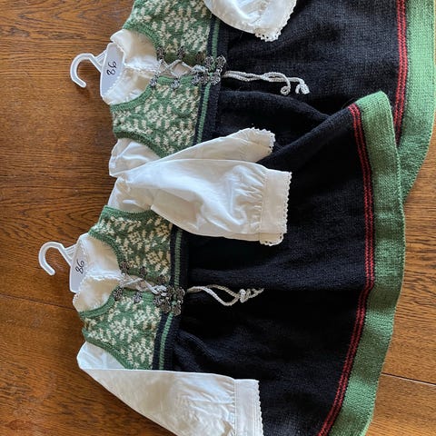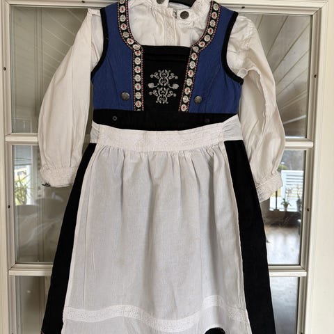 bunadkjole for jente i størrelse 104/ 110. Sett bestående av kjole med grønt liv og mørk skjørtedel med flerfarget bånddekor, hvitt forkle, hvit skjorte og kyse/lue med matchende bånd. Plaggene er i bomull. Egnet som penklær til høytider og andre anledninger.