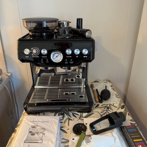 Selger min Sage Barista Express kaffemaskin i fargen Black Sesame. Maskinen ble kjøpt i starten av 2025 fra Bakkeren & Kokken for 9999kr.