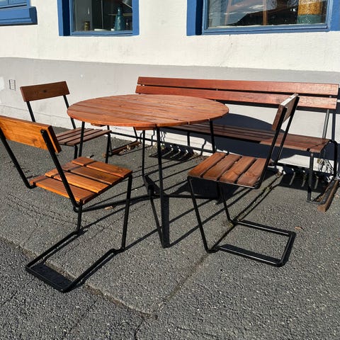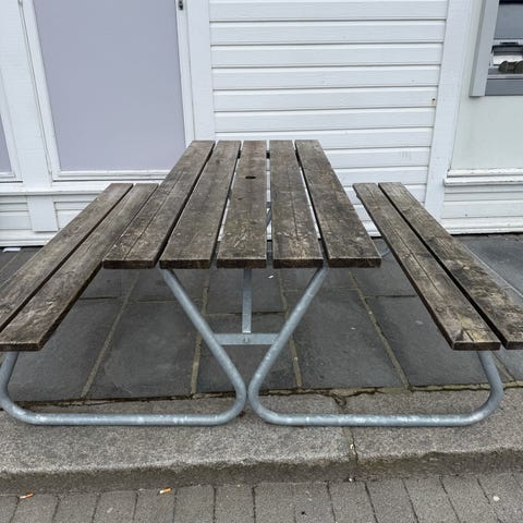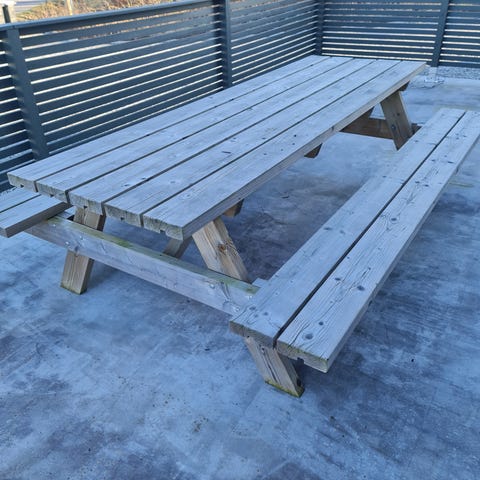 Plassvennlig Piknikbord med to faste benker i tre og metall. Solid bygd og kan stå ute hele året. Understeller i galvanisk stål. Kom med bud.