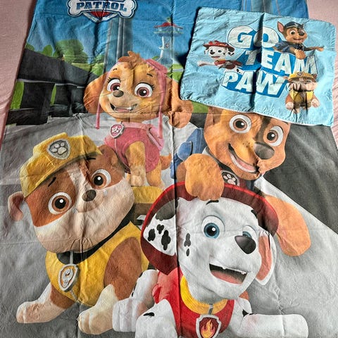 Dozy dundyne (svanemerket) og 3 ulike bomull sengesett for barn gis bort. Alt er vasket og dundynen er godt tørket i tørketrommel. Dyne og dynetrekk har størrelse 100*140cm. Grått putetrekk er 35*55 cm, Paw Patrol putetrekk er 40*45 cm og 35*50 (ca mål). Pute følger ikke med.
