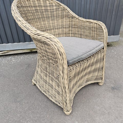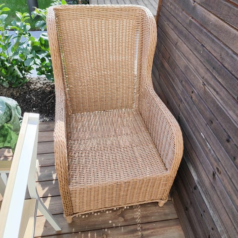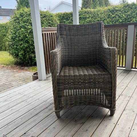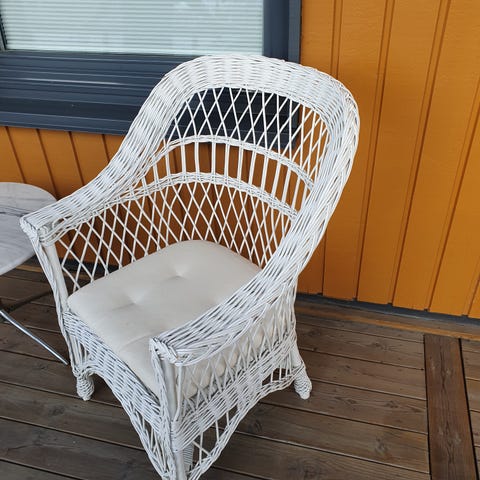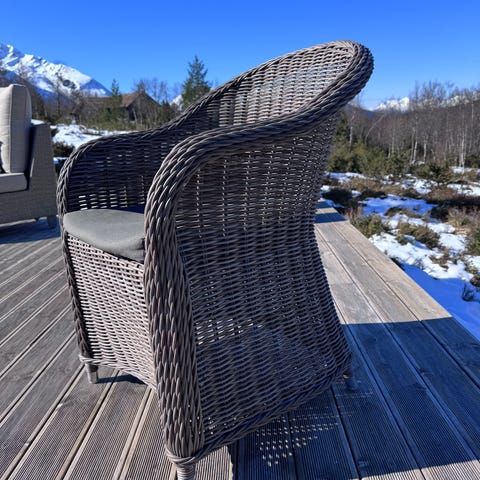 Kurvstol i kunstig rotting med høy rygg og integrerte armlener. Stolen har en løs, hvit sittepute for økt komfort. Egnet til bruk på terrasse, balkong eller innendørs i oppholdsrom. Nøytral farge som passer inn i ulike miljøer og innredningsstiler.