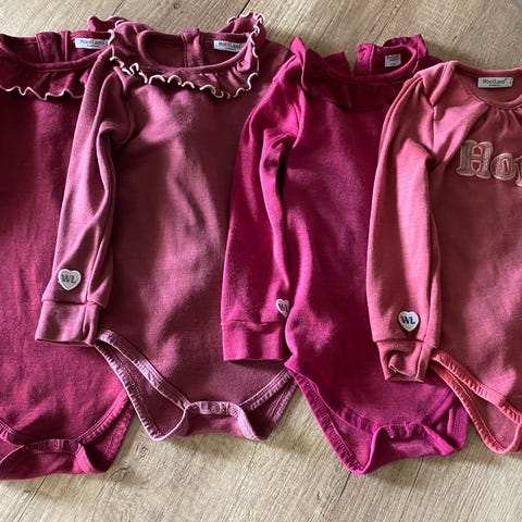 WoolLand bodyer i merinoull for jente i størrelse 62/68. Bodyene har lange ermer og er i ulike rosatoner. Noen av bodyene har englevinge-motiv på ryggen og/eller volangdetaljer på skuldrene. Plaggene er laget i myk merinoull som egner seg godt til baby store deler av året. De tre lyseste bodyene har noen flekker/misfarging og en av de har to små stoppede hull på rumpa.
