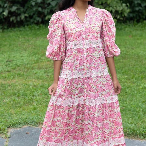 Fra nett: Hira Maxi Dress fra Love Lolita er laget i et lekkert stoff med et hint av gyllen skimmer. Maxikjolen er designet med store puff-ermer og strikk i ryggen som gir en flatterende passform.