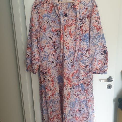 Masai kjole i størrelse L. Kjolen er laget av 100 % viskose. Modellen har lange ermer og knappelukking bak. Passer som hverdags- eller penkjole avhengig av styling.