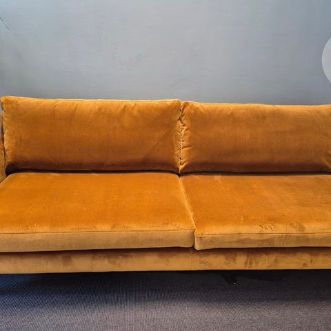 Pen og komfortabel sofa i sennepsgul fløyel. Kjøpt på Trademax for et par år siden. Nypris 15999. Lite og svært pent brukt. Et valgfritt antall puter følger med.
