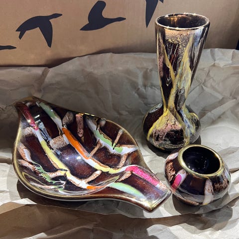 Vakkert sett med fransk mid-century keramikk fra den kjente produsenten Saint-Jean-du-Désert i Marseille. Dette er det klassiske "Vincent & Mireille"-mønsteret, preget av en fantastisk solnedgangsglasur i oransje og gult med sorte silhuetter av provençalske furutrær. Hver del er prydet med den karakteristiske 3D-dekoren av en sikade (cigale), som er selve symbolet på Provence. Settet er håndmalt og signert L.Berty. Dette er flotte samleobjekter som bringer fransk vintage-sjarm rett inn i stua!