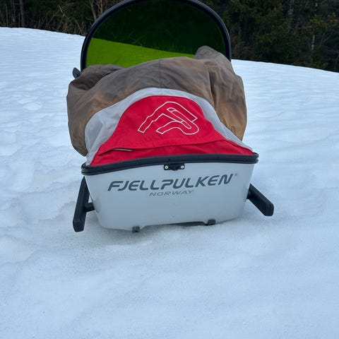 Fjellpulken barnepulk i rød farge med medfølgende drag og sele. Pulk med overdel i tekstil og vindskjerm, samt underdel med meier til bruk på snø. Egnet for transport av barn på tur vinterstid, der selen festes rundt den som trekker pulken og draget kobles mellom sele og pulk for stabil trekking.
